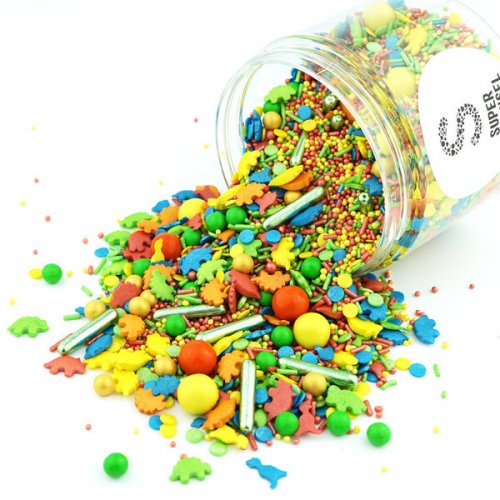 Mix dinosauri di zucchero, palline grandi di cioccolato giallo e arancio e palline di cioccolato piccole verde e oro.