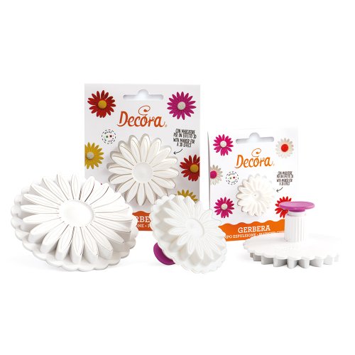 Realizzati in materiale plastico adatto al contatto con alimenti. Creati per realizzare meravigliosi fiori in pasta di gomma e in pasta di zucchero. Oltre a tagliare la pasta di gomma nella forma della gerbera, lo stampo consente di imprimere sulla superficie le venature ed i dettagli dei fiori.