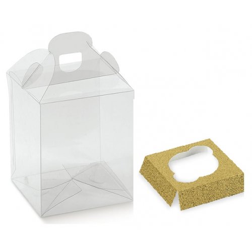 Scatola in pvc trasparente, con maniglia, con fondino in cartoncino teso con foro fustellato per inserire cupcake o muffin.